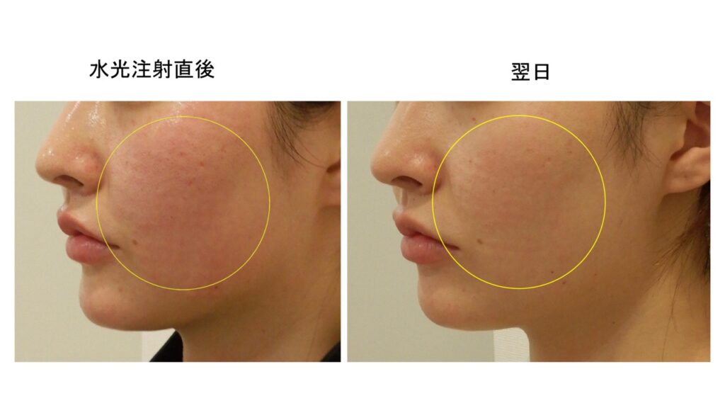注入する時と薬液が肌に浸透していく痛みがあり、塗る麻酔をしても少し感じます。施術後~3日程度はお顔全体に膨疹(小さいポツポツ)ができます。写真は施術直後と翌日です。