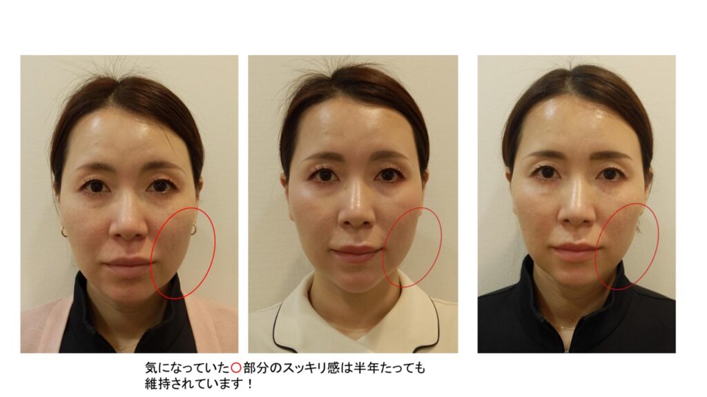 施術前・1か月後・半年後の比較ですが、全体的なもたつきがシュッとなり、半年後も維持されています。赤い〇部分のもたつき、マリオネットライン、影が気になっていましたが、改善し、維持されているなと感じます。