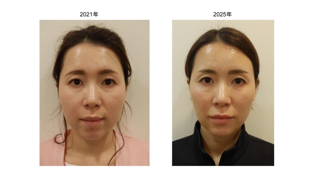 2021年と現在、年齢を重ねましたが下膨れがやっと解消され、ほほは高く、フェイスラインはスッキリという理想に近づいてきました!今の自分のお顔のりんかくは、ボトックスの継続、たまーにハイフや糸リフト、高周波が仲間入りしたことが大きいと感じています。